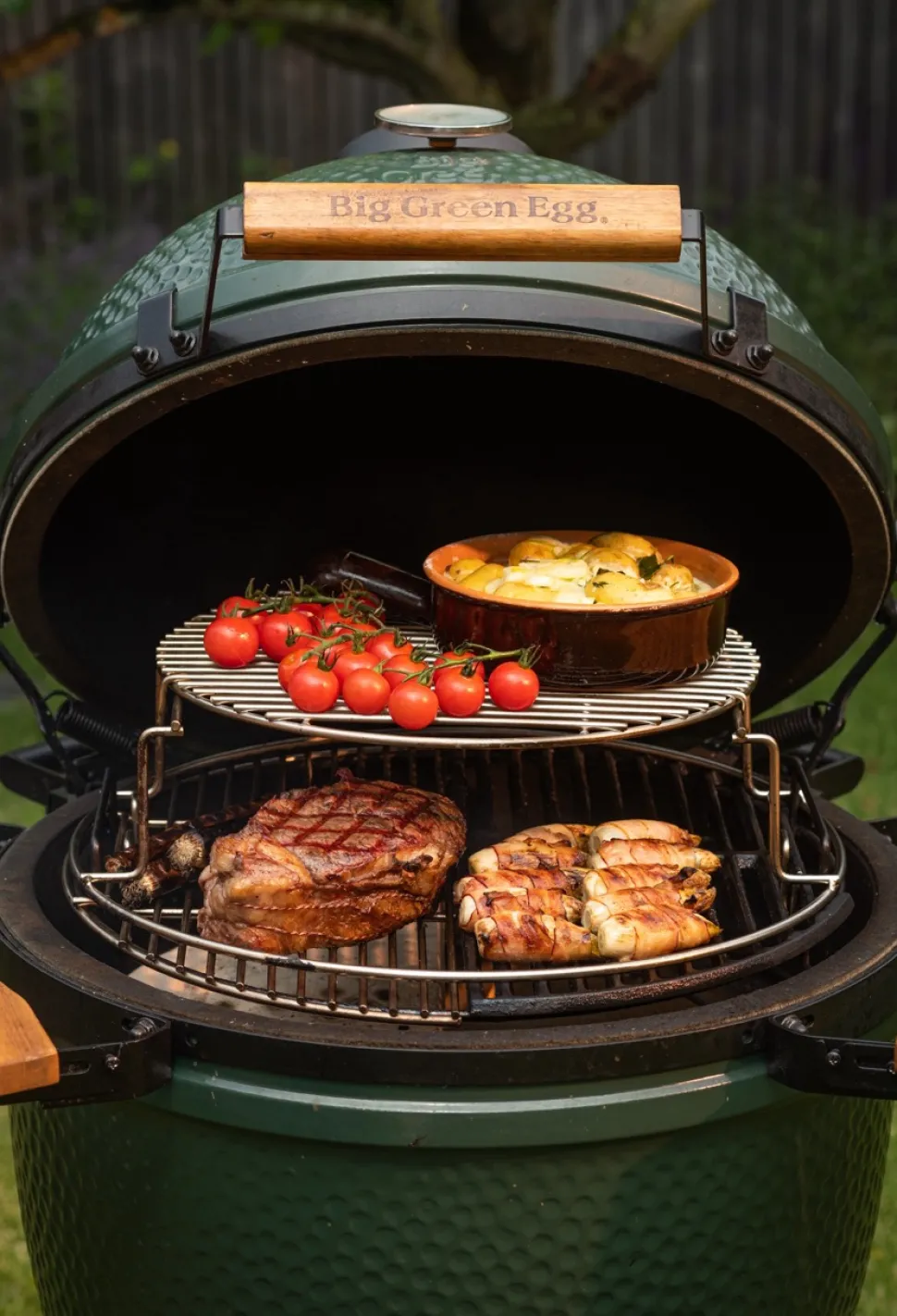 Doordat hij zo ruim is kan je perfect een direct en een indirect kookgedeelte creëren, een mooi formaat pizza bakken en een paar varkensnekken gelijktijdig slowcooken om pulled pork te maken! Ook is er veel keuze uit verschillende soorten rekken en ‘verhogers’. Met die rekken en ‘verhogers’ kan je tot zo’n 10 kg vlees of vis klaarmaken kan je met gemak voor ongeveer acht personen grillen, bakken, stoven of roken. Voor aardappel- en groenten gerechten kan je zelfs pannen en ovenschalen op het rooster plaatsen.