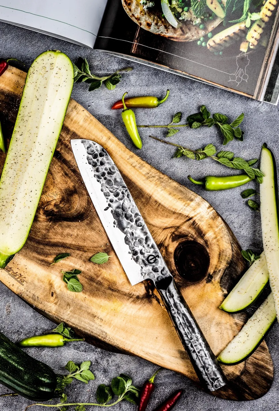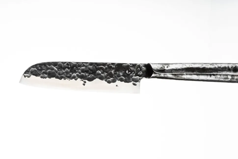 De messen uit de serie Brute worden met de hand vervaardigd en hebben een groffe en machinale afwerking. Het handvat is gemaakt van opgerold roestvrij staal. De opening in het handvat en bij de krop maken deze serie stoer en robuust. Met de santoku maak je de perfecte hakbeweging, ideaal voor het snijden van groente en kruiden.