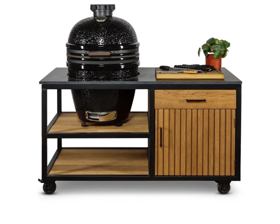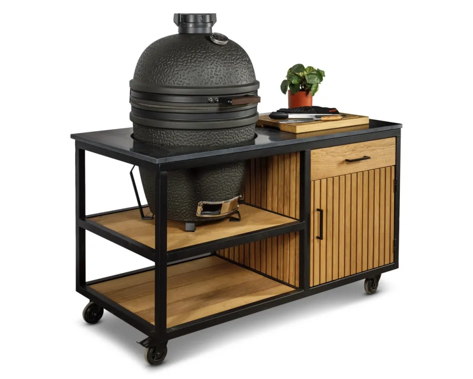 Met afmetingen van 146 x 70 x 90 cm, een ruime kast en lade, biedt de tafel voldoende ruimte voor jouw kamado en accessoires. De kamado zet je stabiel in een tafelnest of op. Bovendien is de tafel gemakkelijk te verplaatsen dankzij vier stevige zwenkwielen, waarvan twee voorzien zijn van een rem. Perfect voor flexibel gebruik in je tuin of op je terras.
