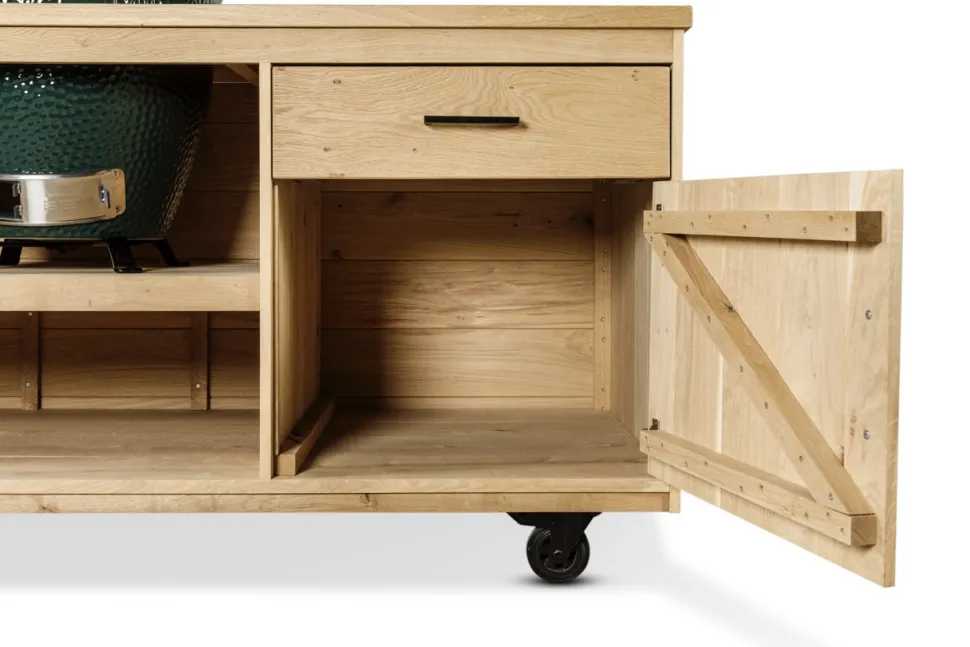 Met afmetingen van 150 x 72 x 90 cm, een ruime kast en lade, biedt de tafel voldoende ruimte voor jouw kamado en accessoires. De kamado zet je stabiel in een tafelnest of op keramische voetjes. Bovendien is de tafel gemakkelijk te verplaatsen dankzij vier stevige zwenkwielen, waarvan twee voorzien zijn van een rem. Perfect voor flexibel gebruik in je tuin of op je terras.