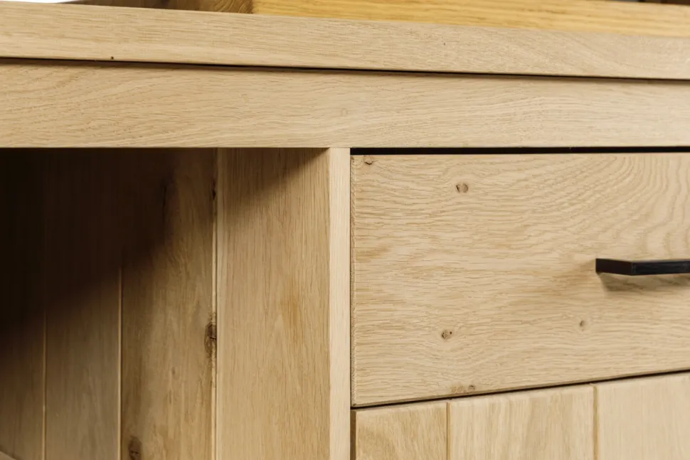 Een prachtig meubel gemaakt van eikenhout uit Frankrijk, wat toch wel het meest bekende land is voor hoog kwaliteit eikenhout. Van nature is eiken erg sterk en duurzaam en is van zwaardere kwaliteit dan bijvoorbeeld douglas. Hout kan altijd nog een beetje werken, het is immers een natuurproduct. Om de kans op krimpen en uitzetten te verminderen kiezen wij ervoor om extra dikke balken en planken te gebruiken. Daarnaast is ons hout wind/lucht gedroogd, dit wil zeggen dat het hout al een aantal jaar heeft kunnen werken. De kosten van het hout liggen wel wat hoger, maar zo heb je langer plezier van het strakke meubel vinden wij. Het heeft tevens als voordeel dat je een erg massief product krijgt wat er stoer uitziet.