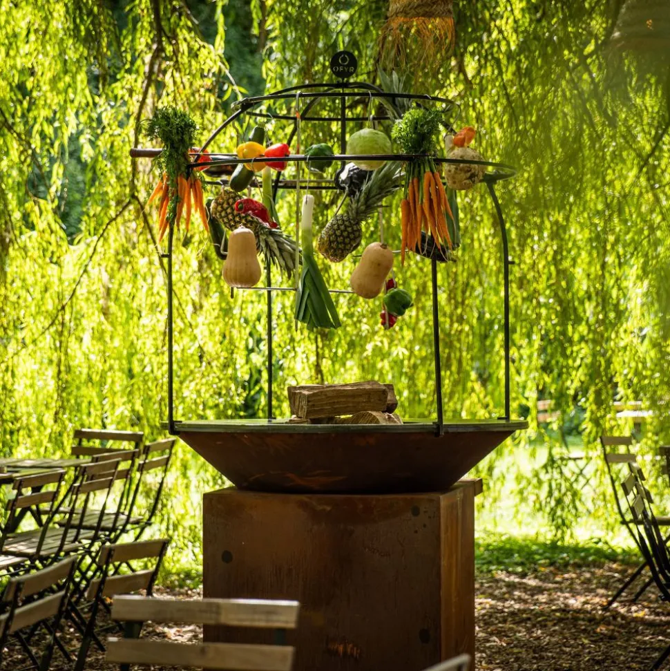 De OFYR Cage is het perfecte accessoire voor de chef die van showcooking houdt. Dankzij de koepelvormige structuur kan het voedsel aan de stalen bogen worden opgehangen, waardoor een uniek en interactief visueel element ontstaat.