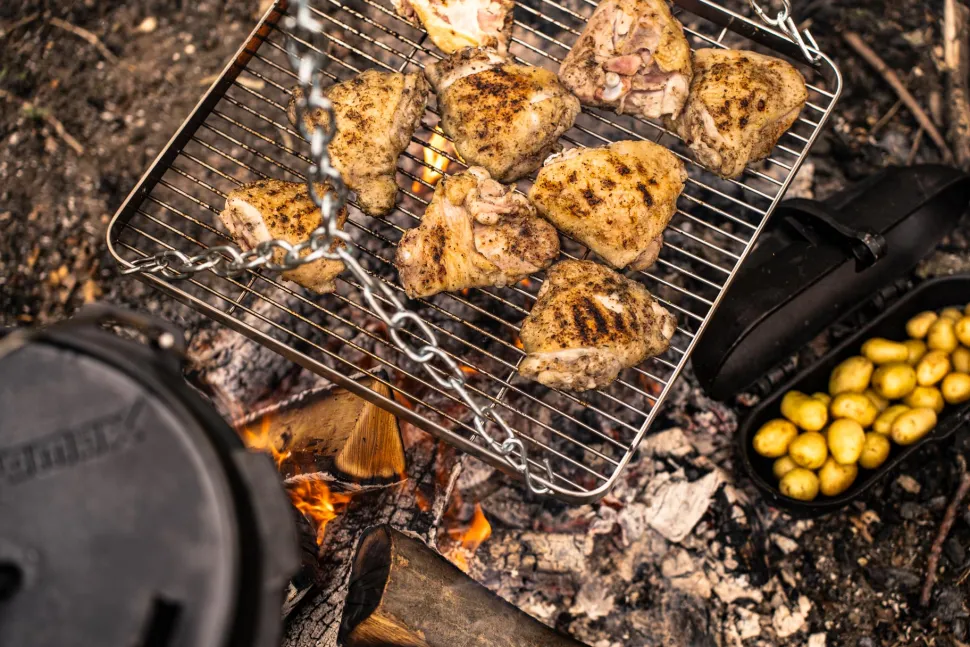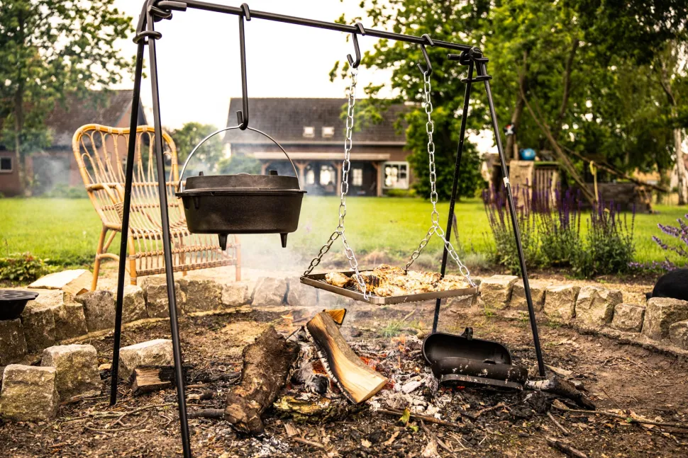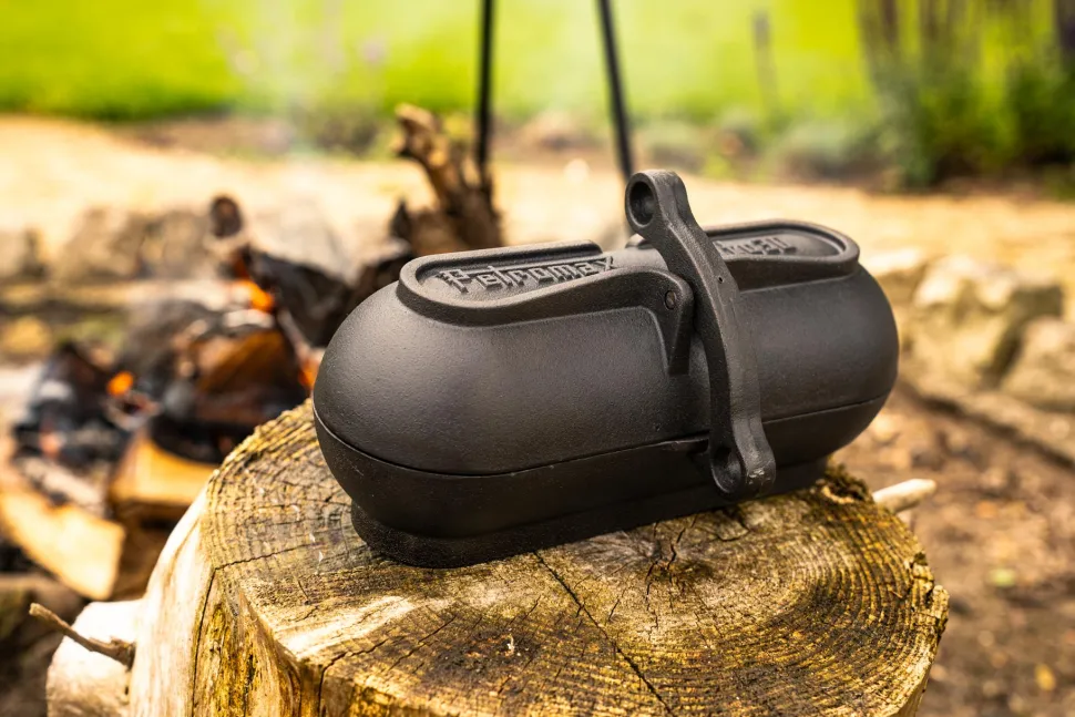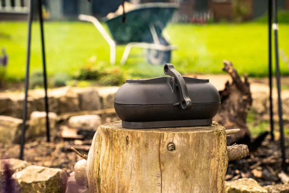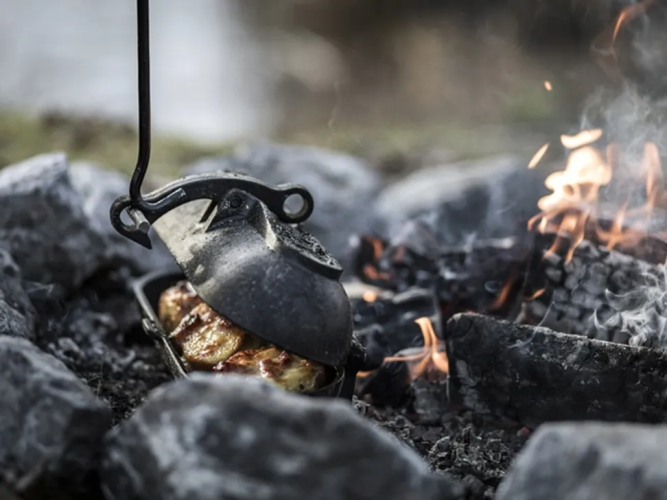Wanneer de aardappelpoffer in het vuur ligt kun je hem met een deksellifter en de handige ring aan het sluitingsmechanisme gemakkelijk uit het vuur halen, zodat je veilig kunt genieten van heerlijke gepofte gerechten.