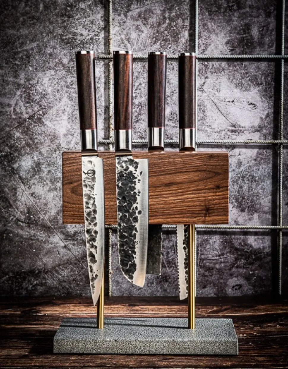 Een super mooi magnetisch messenblok van walnoothout met een natuurstenen voet. Ideaal om je collectie messen op kwijt te kunnen. Het messenblok is aan beide zijden magnetisch, hierdoor kun je in totaal tot wel tien messen hier aan hangen.