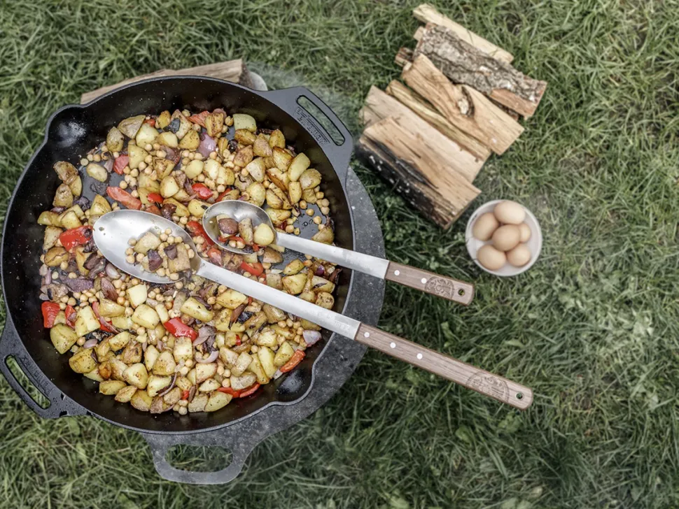 Openvuur koks hangen hun Petromax Serveerlepel aan de Cooking Tripod of aan een haak met behulp van het koordoog in het walnoothouten handvat. Zo is de lepel nooit ver weg en kun je direct serveren als de ovenschotel klaar is.