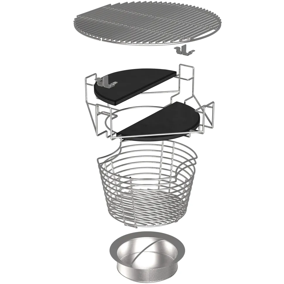 - Twee halve RVS roosters: speel met je temperatuur door je roosters in verschillende hoogtes op te stellen.