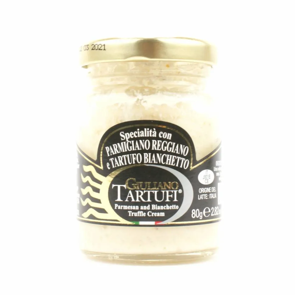 Een prachtige truffelcrème met parmazaanse kaas en 3% bianchetto. Deze truffel, ook wel bekend als de maarttruffel vanwege zijn piek in maart, is klein van formaat maar heeft een intense geur en smaak die vergelijkbaar is met andere truffelsoorten.
