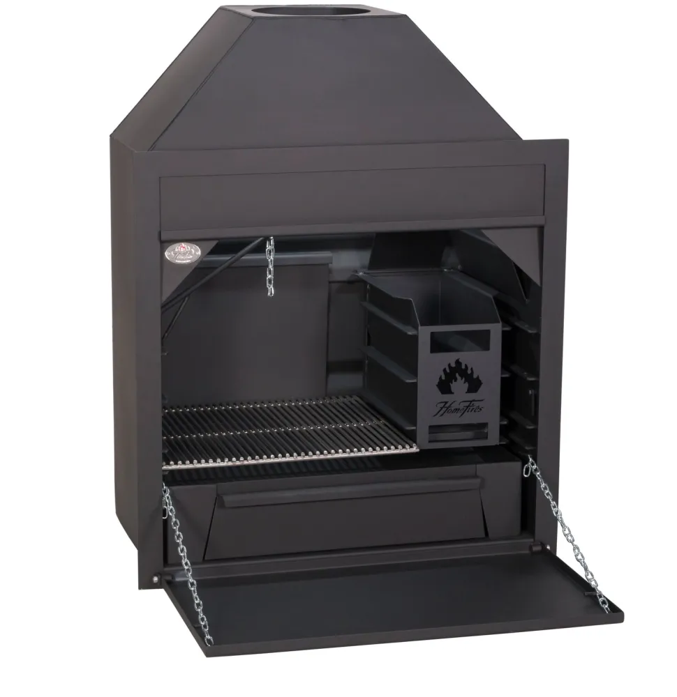 De Home Fires Built-in 800 is 80 cm breed. De kolenmaker hangt rechts waardoor er een grilloppervlakk van 54×46 cm beschik- baar is. De braai is ook uitgerust met een grote kooklade. De achterwand van de braai heeft een hitteschild en de kolen- maker is geïsoleerd aan de achterkant.