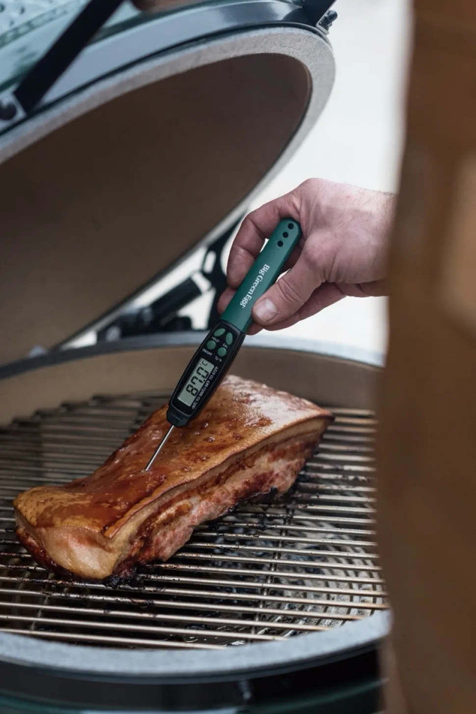 De Big Green Egg Large is de meestverkochte maat uit de Big Green Egg serie. En dat is niet voor niets! Met deze uitvoering bestel je direct het onderstel, acacia zijplankjes en hoes mee. De large weegt 73 kg en het rooster heeft een diameter van 46 cm. Doordat hij zo ruim is kan je perfect een direct en een indirect kookgedeelte creëren, een mooi formaat pizza bakken en een paar varkensnekken gelijktijdig slowcooken om pulled pork te maken!