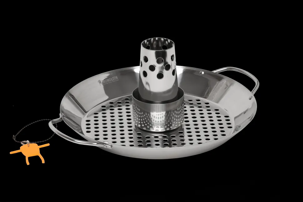 Gevogeltehouder van roestvrij staal voor het bereiden van sappige kip. De verwijderbare houder kan naar keuze met bier, wijn of andere aromatische sappen gevuld worden. In de geperforeerde pan kan tegelijkertijd groente worden bereid. Zo kun je dus tijdens de bereiding van je kip je complete maaltijd maken!