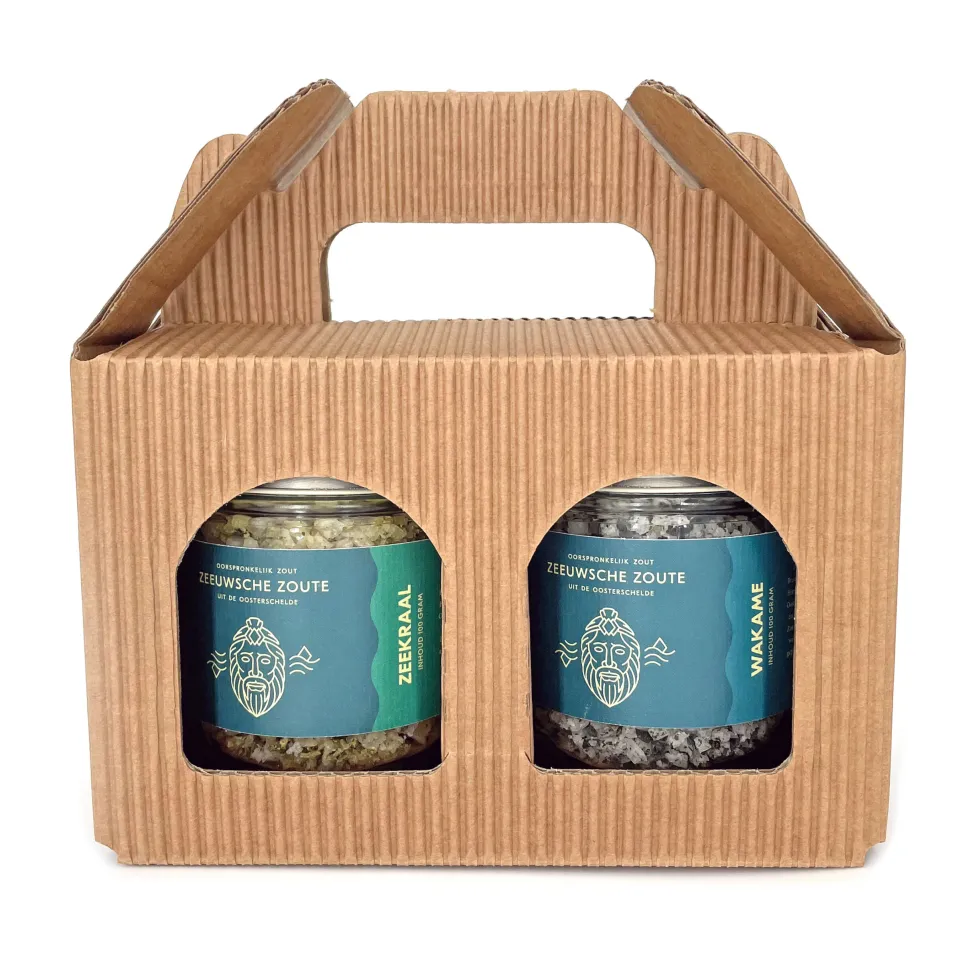 Een duoset om cadeau te doen. Het pakket bestaat uit Zeeuwsche Zoute Zeekraal en Zeeuwsche Zoute Wakame. Zeeuwsche Zoute Zeekraal is perfect voor smaakcombinaties waarin een lekkere, zoute smaak gewenst is, gecombineerd met het ziltige dat de zoutminnende groente zeekraal kan geven.