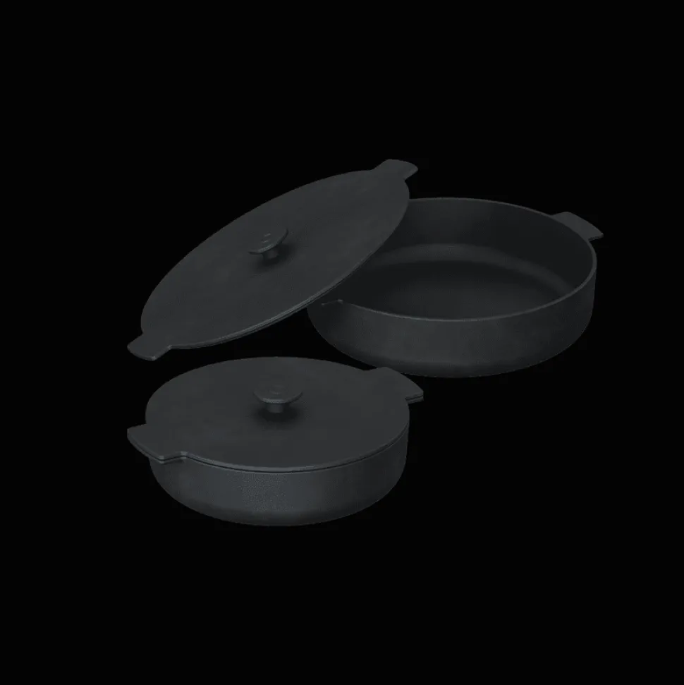 De OFYR Cast Iron Casserole set bestaat uit twee strak vormgegeven gietijzeren pannen met diameters van 21 cm en 26 cm. De pannen zijn geschikt om op de OFYR kookplaat gebruikt te worden. De pannen zijn voorzien van goede warmteverdeling waardoor ze geschikt zijn voor de bereiding van allerlei gerechten.