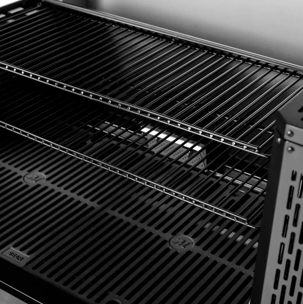 - Inclusief omkeerbare rook- en schroei-gietijzeren roosters voor low & slow of dichtschroeien op hoog vuur