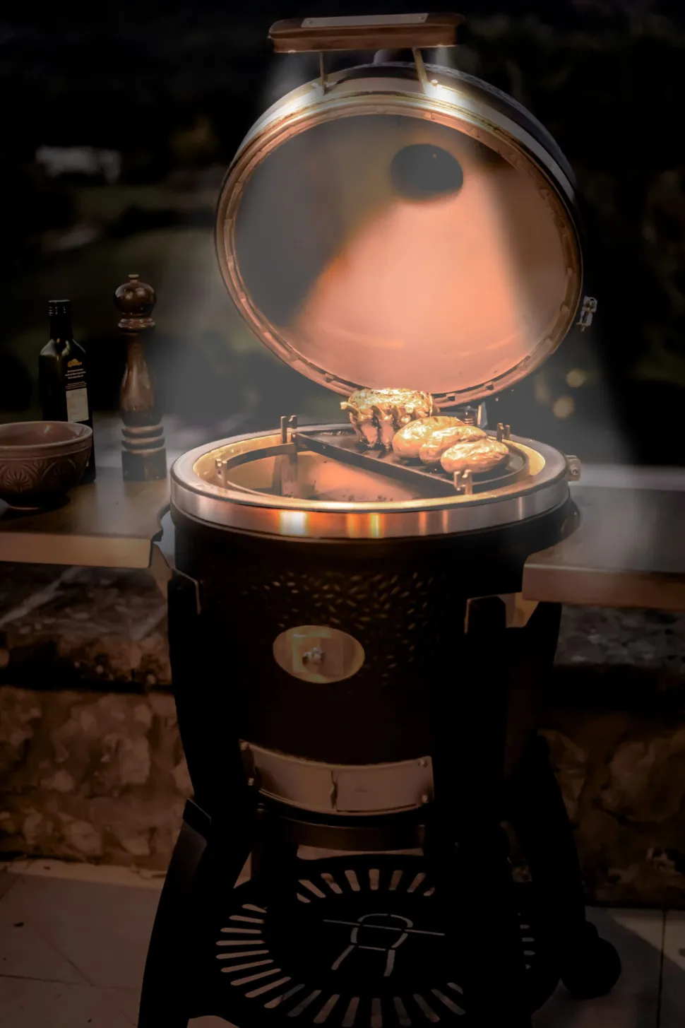 De Monolith Avantgarde Le Chef heeft alles wat je op een kamado wenst! Een degelijk robuust onderstel wat zich goed verhoud op verschillende soorten ondergrond, LED verlichting in de handgreep, roestvrijstalen beslag en natuurlijk een hoogwaardig keramiek wat de warmte goed verdeeld. Tevens ziet de matzwarte finish van de kamado er super gelikt uit in je tuin! Wil je de kamado inbouwen in een houten meubel? Dan dien je de keramische voetjes er bij te bestellen.