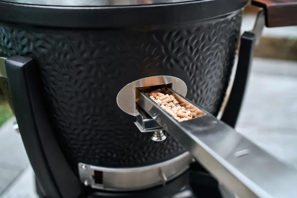 Verfijn je barbecuespecialiteiten met de beste rookaroma’s en geniet van echte rookspecialiteiten. Het geïntegreerde pellet en rookhout toevoersysteem bied je een ingenieuze manier om het rookmateriaal op de gloeiende houtskool te doen belanden zonder het deksel te hoeven openen.