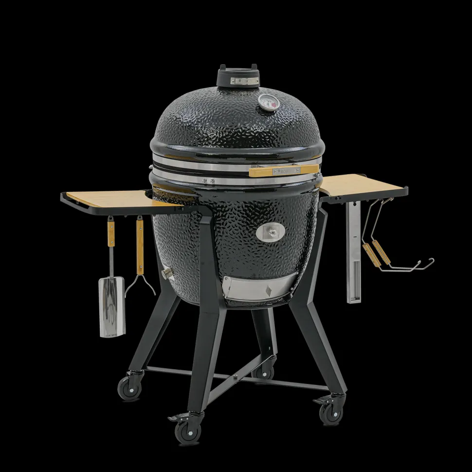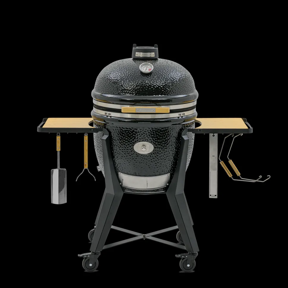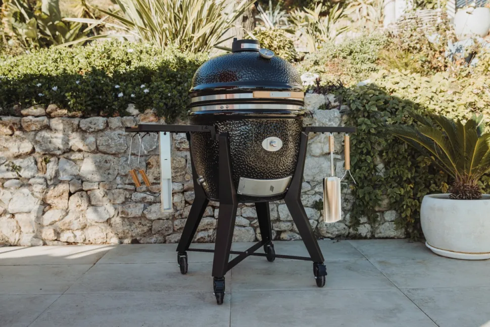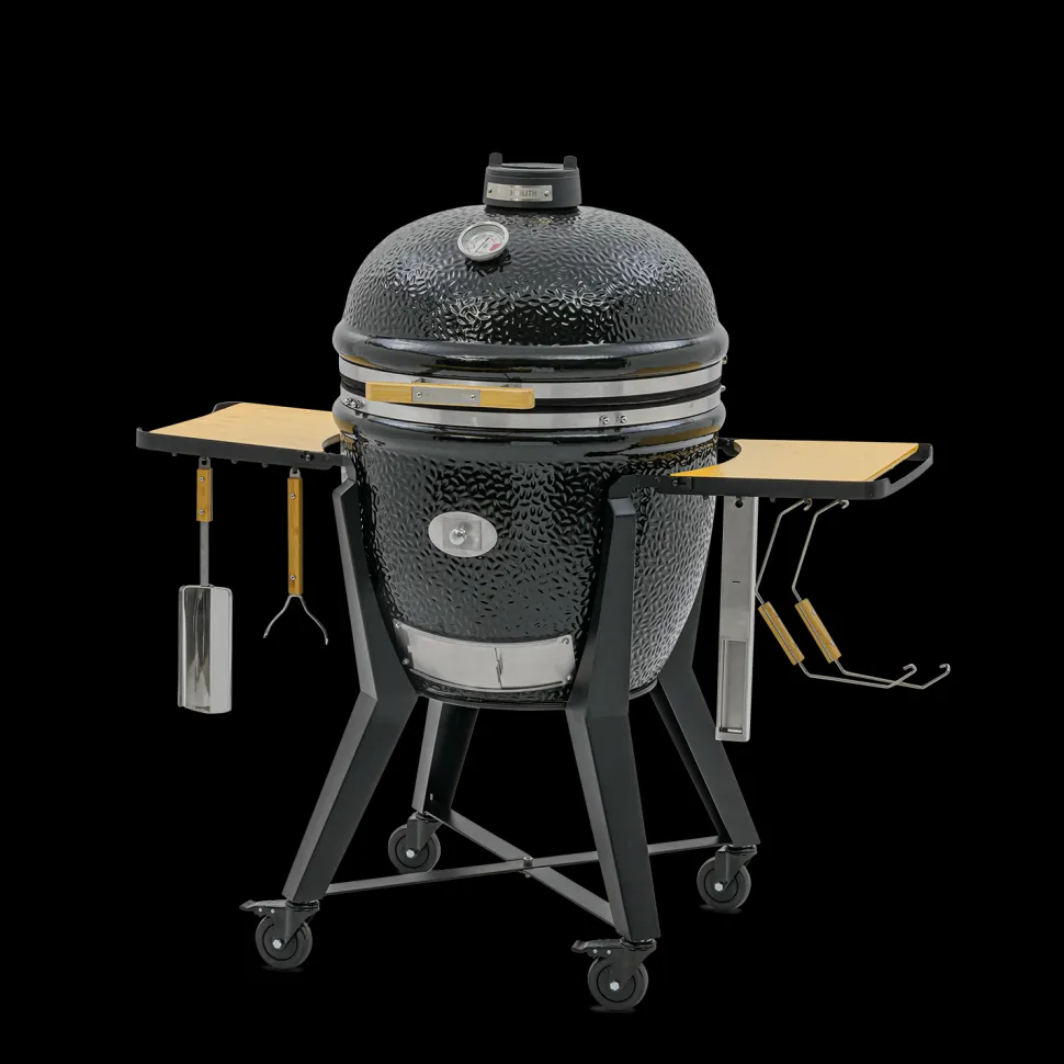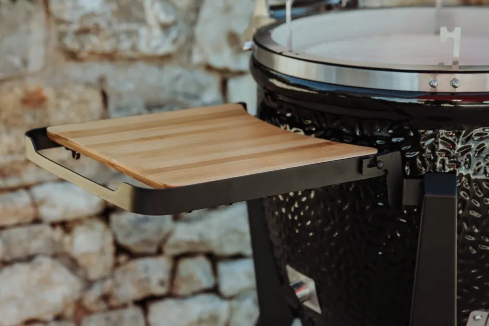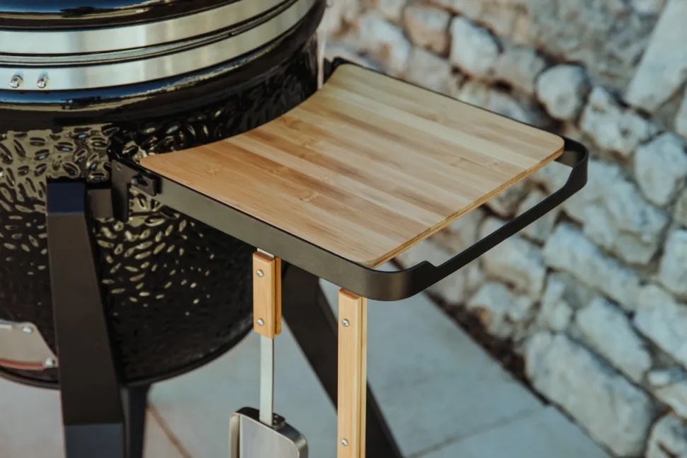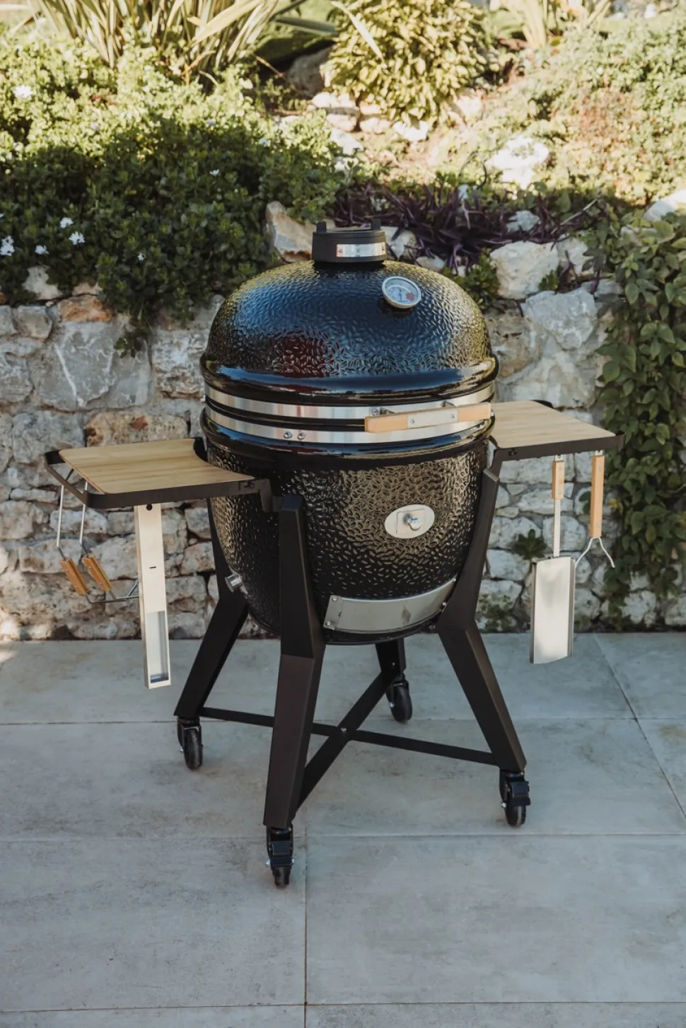 Wat meteen opvalt is het nieuwe onderstel: strak matzwart staal met poedercoating, afgewerkt met stijlvolle bamboe zijtafels. Dat ziet er niet alleen goed uit, maar is ook superpraktisch. De haken voor je BBQ-tools, de soepel rollende wielen en het stabiele frame zorgen ervoor dat je alles bij de hand hebt én dat ‘ie blijft staan als een huis – ook als je ‘m flink aan het werk zet.