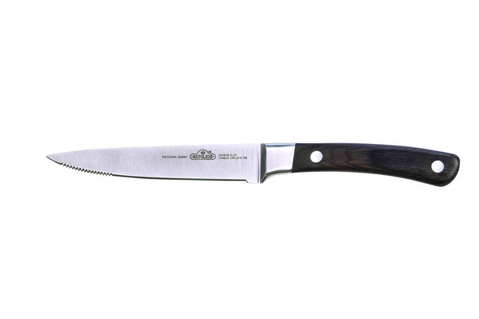 Een steakmes moet twee dingen zeer goed doen. Ten eerste moet het gemakkelijk door het perfect gegrilde stuk vlees snijden en ten tweede er prachtig uitzien. Napoleon’s 12,5 cm lange RVS rozenhouten steakmessen doen dat en meer. Wie zou er niet de hele dag lang zijn biefstuk willen snijden?