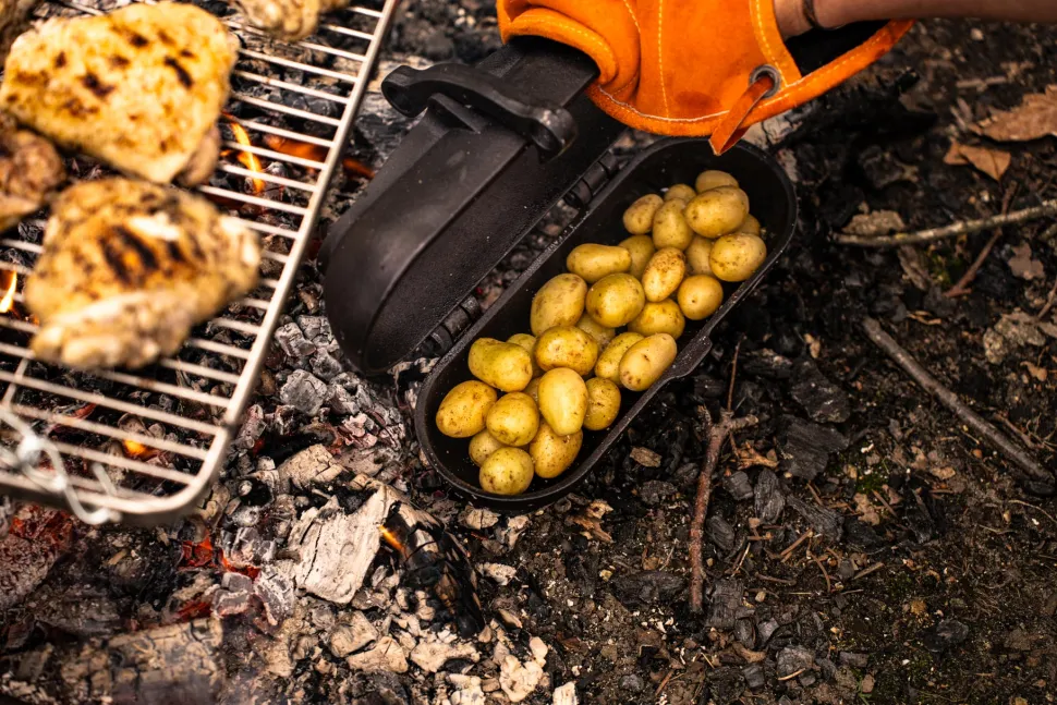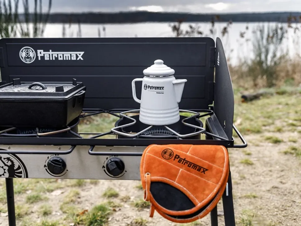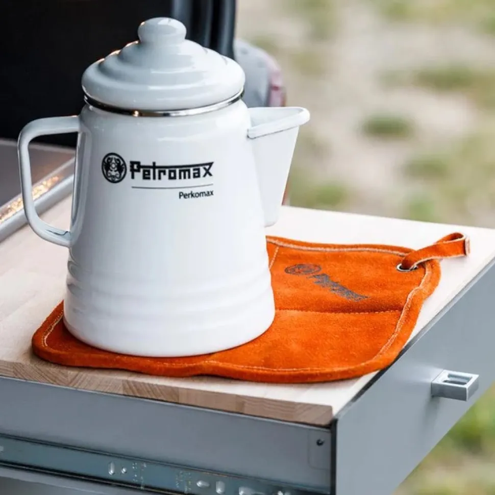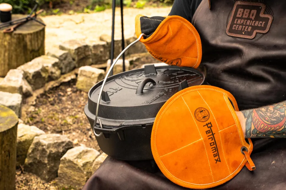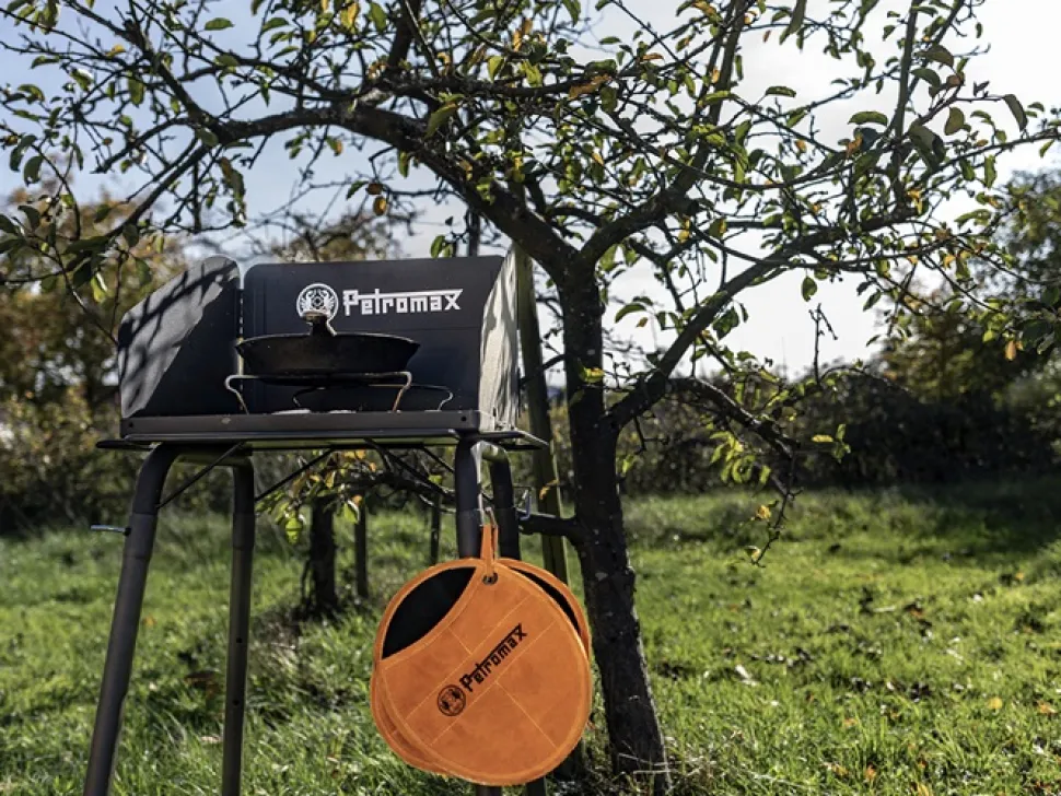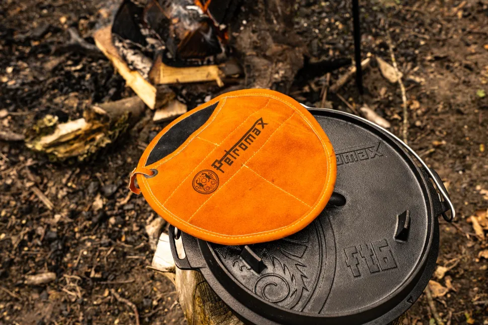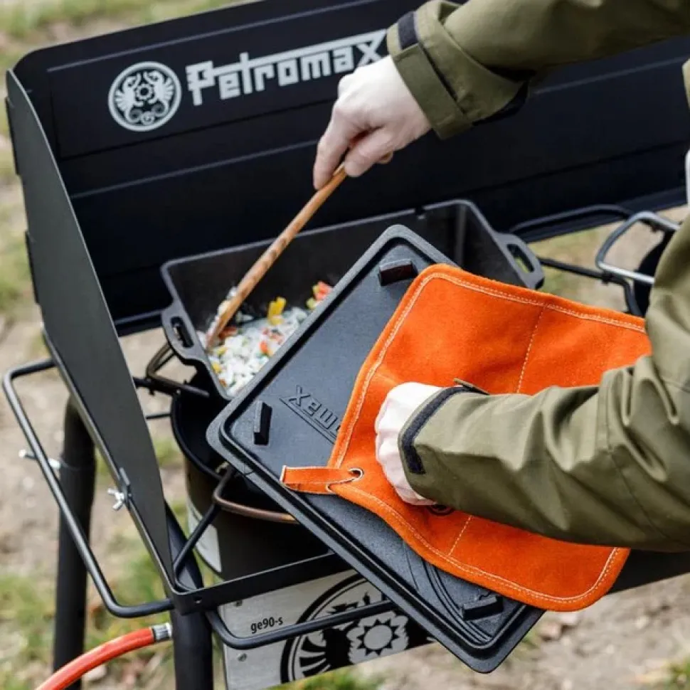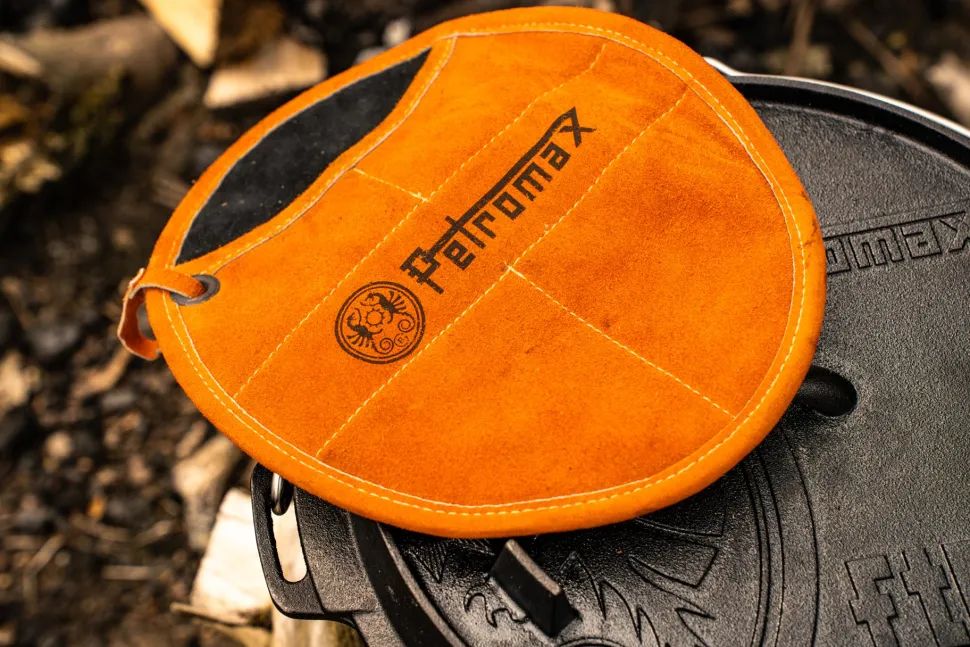 Het natuurlijke ruwe lederen oppervlak zorgt voor extra stevigheid en tegelijkertijd een voor de ideale grip om jouw kookaccessoires op te pakken in de warmte omstandigheden. Zo pak je gemakkelijk je Petromax Dutch Oven of je Skillet van het voor zonder je handen te branden. Je kunt ook tijdelijk je kookgerei op de pannenlappen plaatsen. Hou wel rekening met het oppervlak van de pannenlap voor je iets erop plaatst. De pannenlappen komen in gloeiendheet Petromax Oranje en zijn uitgerust met het traditionele drakenlogo