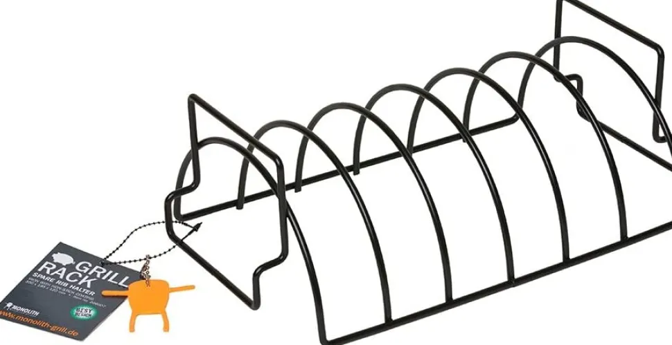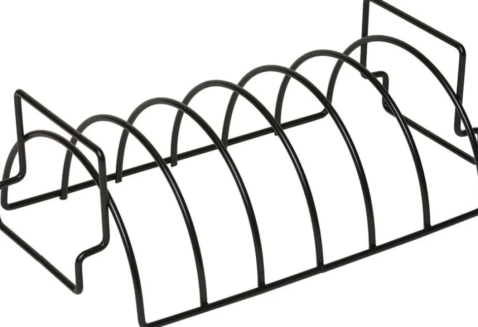 Sparerib houder van zwart gecoat staal voor het plaatsbesparend grillen van ribbetjes. Omgedraaid kun je de houder gebruiken om een groot stuk gebraad op te leggen, dat alle zijdes mooie egaal garen. Zelf gebruiken wij dit accessoire in onze workshop ook om hele vissen tussen te zetten!