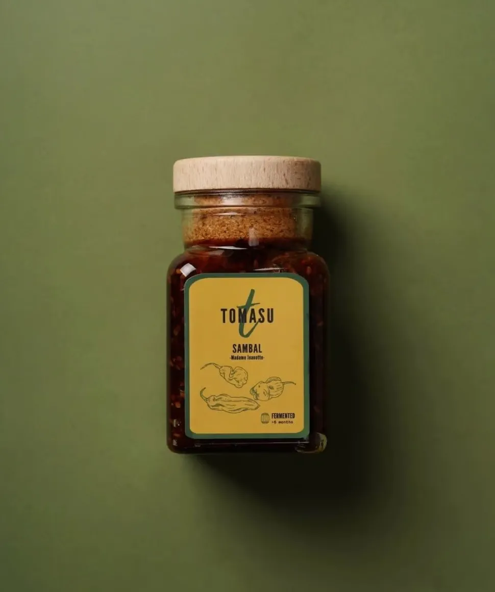 Deze versie van Tomasu sambal is de eerste die gemaakt is met hun eigen gekweekte pepers. Na het brouwen van hun zoete en pittige sojasaus, laten ze het residu zes maanden rijpen. Het resultaat? Een sambal met een unieke diepte en karakter. De gekozen peper bleek niet alleen ontzettend sterk, maar ook geweldig van smaak en geur. Maar het mooiste van alles? Het feit dat ze werken met pepers die ze zelf laten groeien. Dat geeft toch net wat extra voldoening!